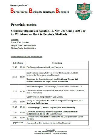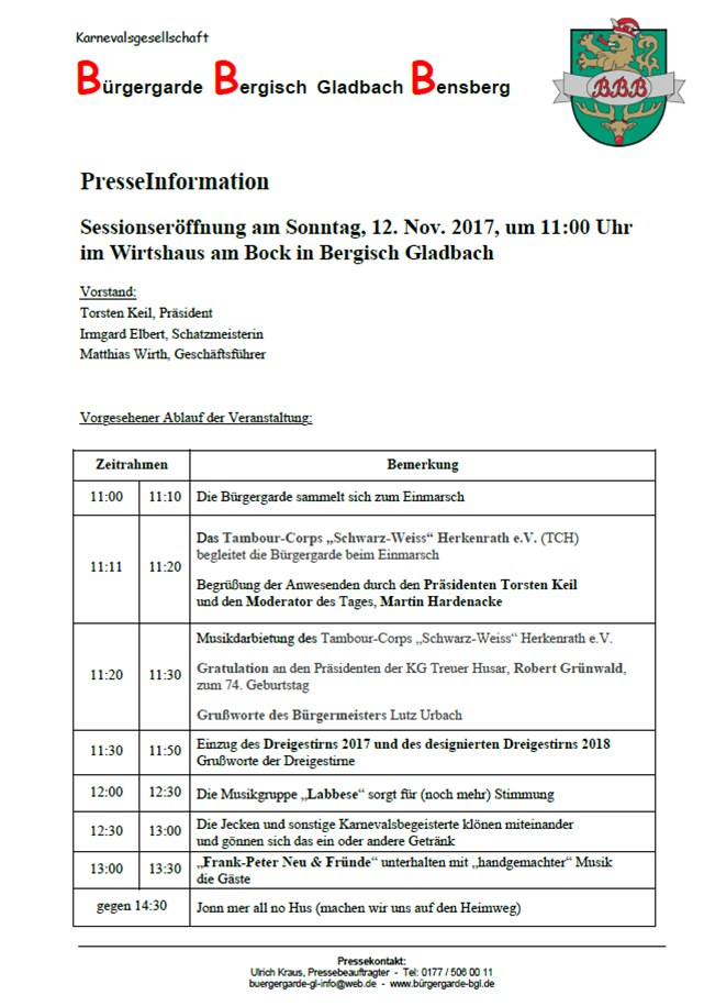 Die Bürgergarde Bergisch Gladbach Bensberg (BBB) lädt Mitbürgerinnen und Mit-Bürger, Karnevalsbegeisterte am Sonntag, dem 12.11.2017 in das Wirtshaus am Bock am Konrad Adenauer Platz im Herzen unserer Heimatstadt Bergisch Gladbach zu ihrer Eröffnung der Session 2017/2018 ein.