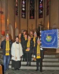 Sodann sprach er das Segensgebet und besprengte die Standarte mit Weihwasser. Ein gemeinsames „Vater unser“ besiegelte die Segnung. Die Symbolik in der Gemeinsamkeit von Kirche und Karnevalsfreude wurde dadurch unterstrichen, indem sich die Mitglieder unseres Schmölzjes im Kreis stehend, an den Händen hielten.