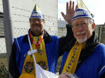 Bevor es aber soweit war, schaute er sich erst einmal die Abbildungen auf der Vor- und Rückseite unserer "Plagge" genau an und liess sich die Symbolik erklären. Im Mittelpunkt ist jeweils das Wappen der Bürgergarde abgebildet. Es ist eine karnevalistische Abwandlung des offiziellen Wappens der Stadt Bergisch Gladbach. Dem Bergischen Löwen wurde eine Narrenkappe aufgesetzt, während der Hirschkopf mit einer roten Pappnase verziert ist. Statt des Zinnenkranzes trennt aber eine Banderole mit den Buchstaben „BBB" die beiden Jecken voneinander.