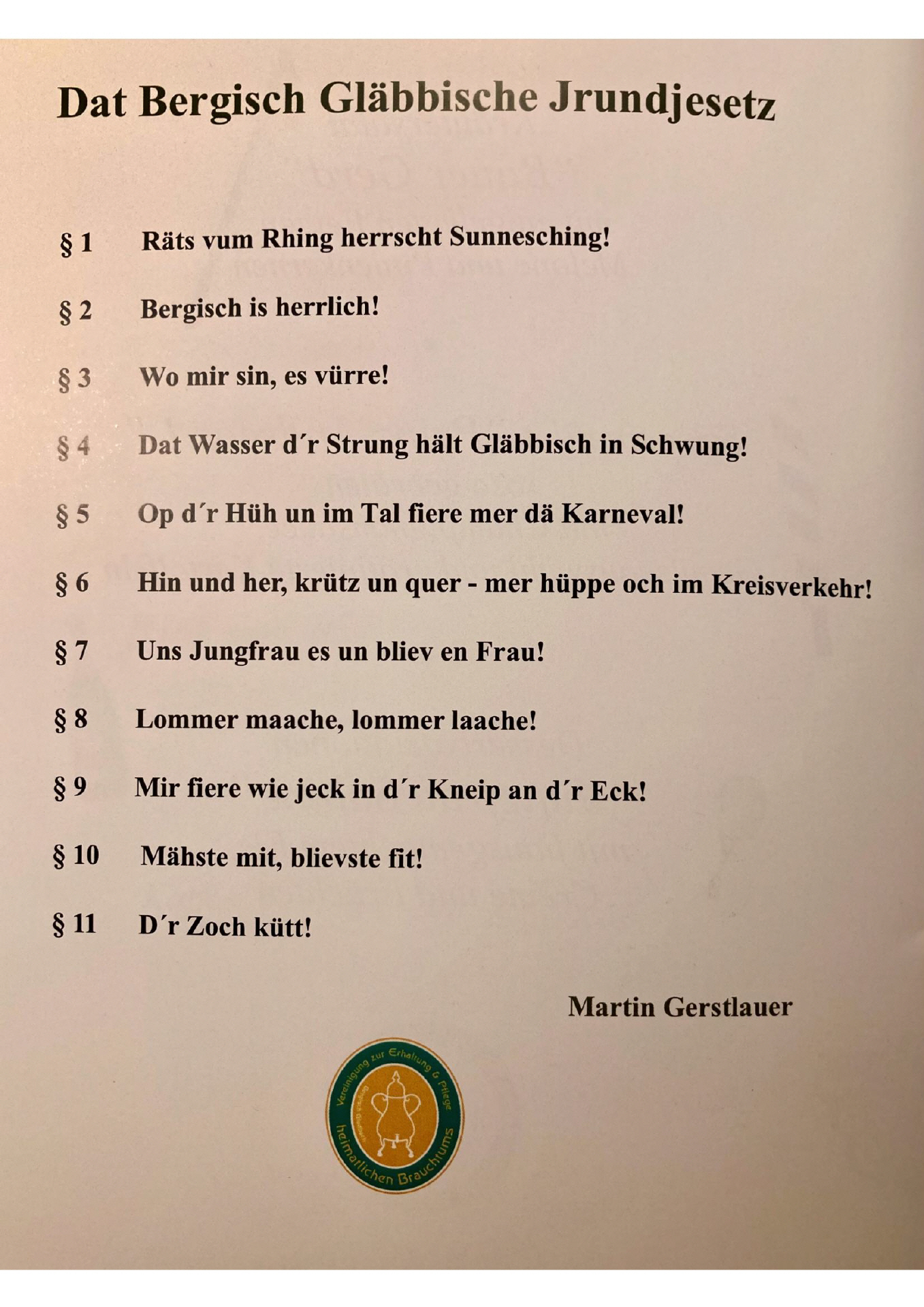 Wir sind integraler Bestandteil der Karnevalsszene in inserer Heimatstadt und stehen zum "Bergisch Gläbbische Jrundjesetz" der „Vereinigung zur Erhaltung und Pflege heimatlichen Brauchtums e.V. Bergisch Gladbach“.