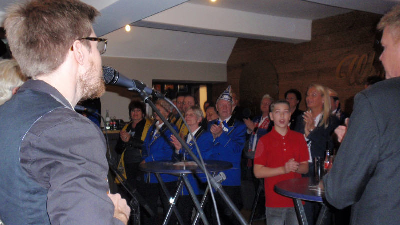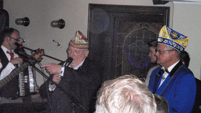 Torsten Keil, Präsident der Bürgergarde, hatte mit seinem Team einen kurzweiligen Vormittag mit Kölsch und Klaaf arrangiert. Dafür, dass die karnevalistische Stimmung langsam aber stetig in Schwung kam, sorgte der diesjährige Montanusplakettenträger Martin Hardenacke als Moderator der Veranstaltung. Er verstand es in gekonnter Manier das Publikum anzusprechen. Mit launigen Worten kündigte er das Tambour-Corps Schwarz-Weiss Herkenrath e.V. (TCH), „Gläbbischer Mottolied-König“ Werner Müller, die „Labbese“, „Et Schnütche – Claudia Roland mit Kölsche Lieder“ und den irischstämmigen Sänger Jeff Collins mit Kölsche Hits und Irish Folk an. Ein gelungener Frühschoppen-Vormittag mit Kölschem Programm.