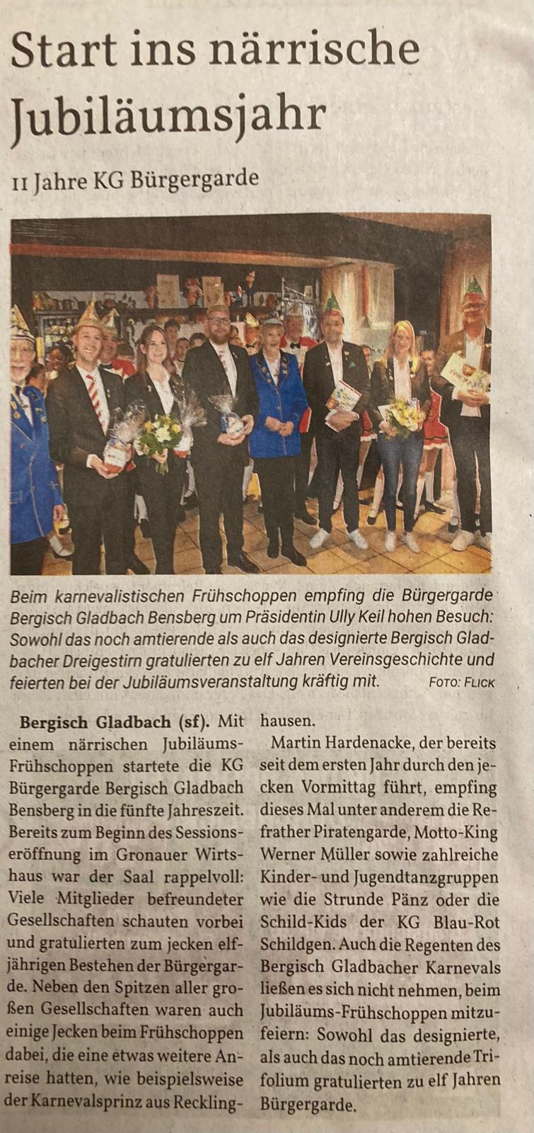 Übrigens: in der neuen Session 2025/2026 feiern wir, die "KG Bürgergarde Bergisch Gladbach Bensberg 2014 e.V." unser 11-jähriges Vereinsjubiläum. Freuen Sie sich mit uns auf dieses Jubiläum "1 x 11"